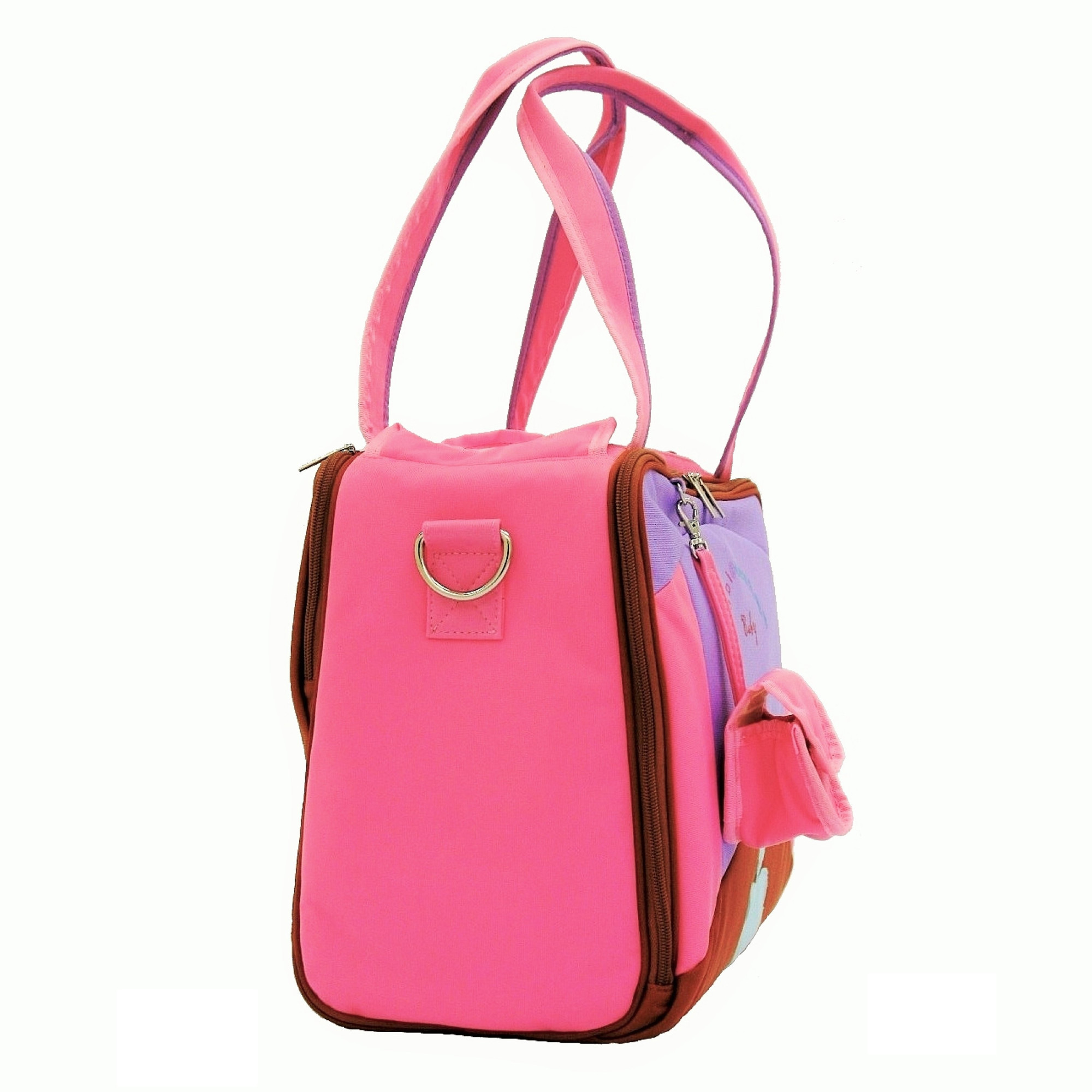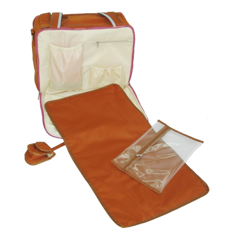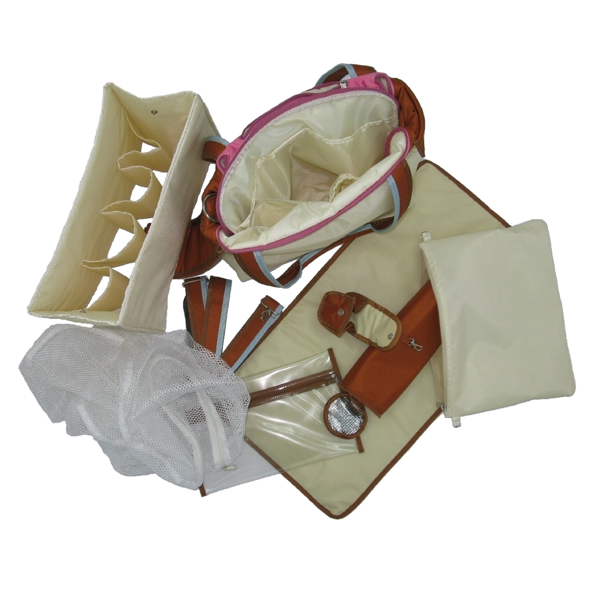此涤纶经编包包外壳具防泼水功能,包中可卸除的框架上共有六个放奶瓶及尿布的口袋。随包还附有: